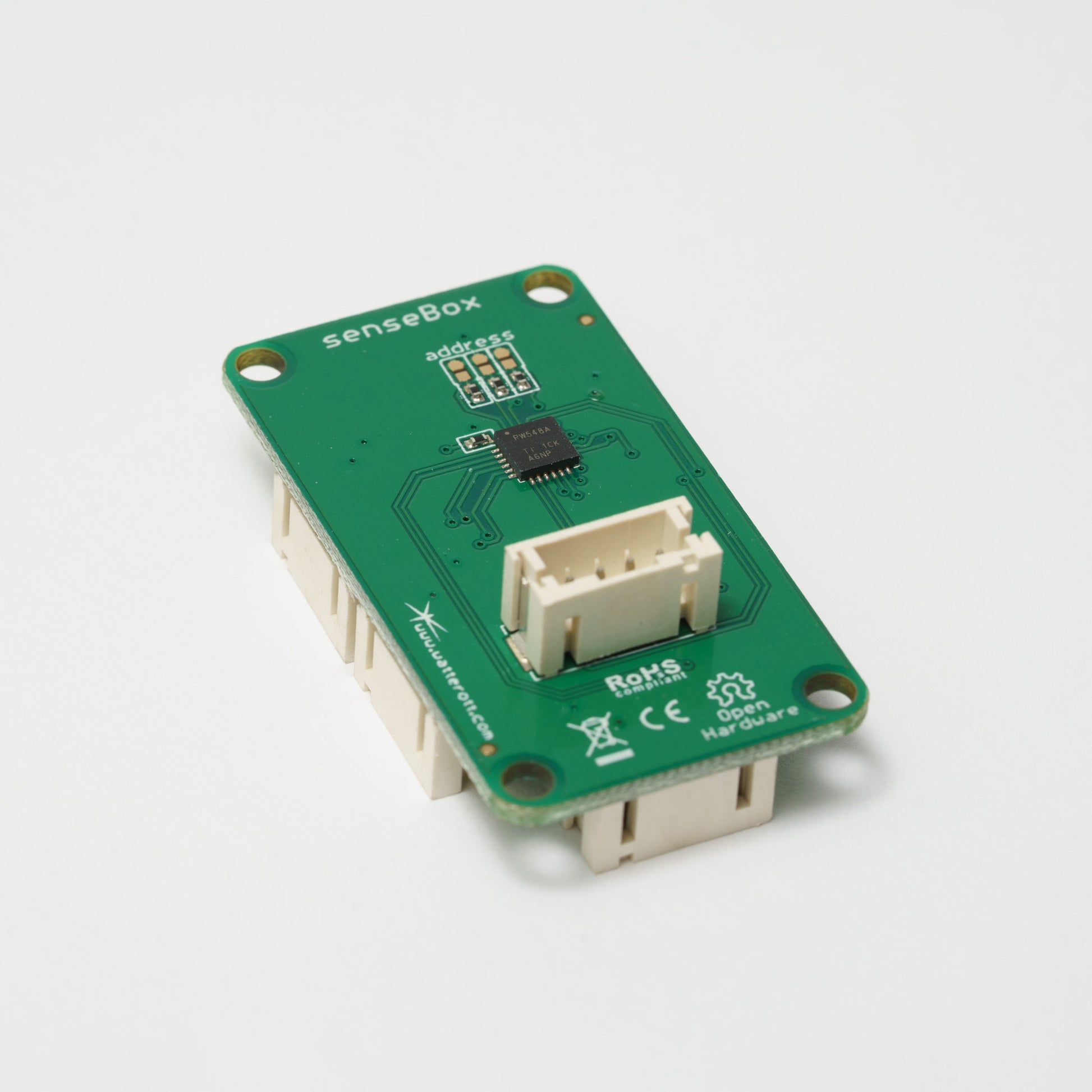 Mit einem senseBox I2C-Multiplexer lassen sich bis zu acht Geräte mit gleicher Adressierung parallel über den I2C-Bus betreiben. Dadurch können zum Beispiel zwei baugleiche Temperatursensoren angeschlossen werden. Dazu wird dem Multiplexer lediglich eine Kanalnummer übergeben, an die alle Folgebefehle gesendet werden. Die Anschlussnummern auf dem Multiplexer (1 bis 8) stehen dabei für die entsprechenden Kanäle (0 bis 7). Über die drei Lötstellen auf der Rückseite besteht weiterhin die Möglichkeit zwischen acht verschiedenen Adressen im Bereich zwischen 0x70 und 0x77 zu wählen. Dies ermöglicht die Kommunikation mit bis zu 64 Geräten mit gleicher I2C-Adressierung.